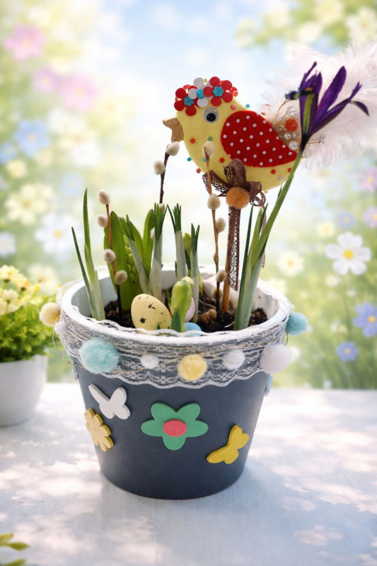 Посадим луковичные, оформим цветочный горшок, декорируем фигурку из пенопласта.